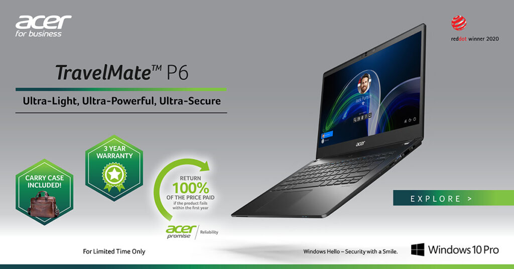 Durable and long-lasting, the TravelMate P6 passes MIL-STD 810G2 and stands up to the rigors of business travel. Outlast a day of meetings or work offsite with a battery life of up to 20 hours3. Power up to 100% capacity in just two hours with Fast Charging, or boost your battery by 50% in less than 45 minutes to keep you powered throughout the day.